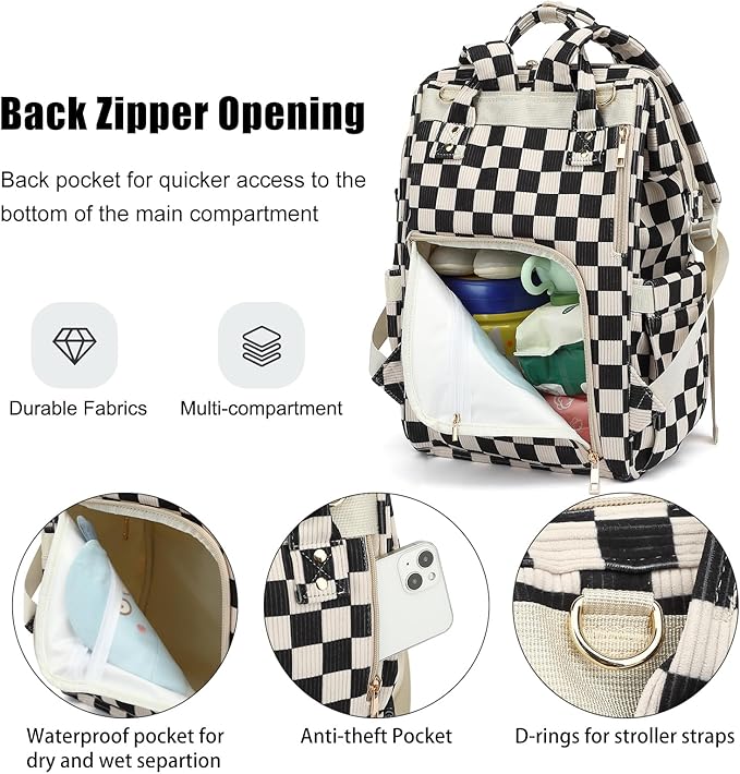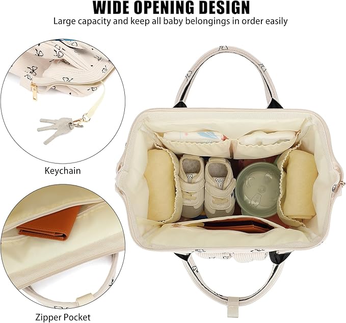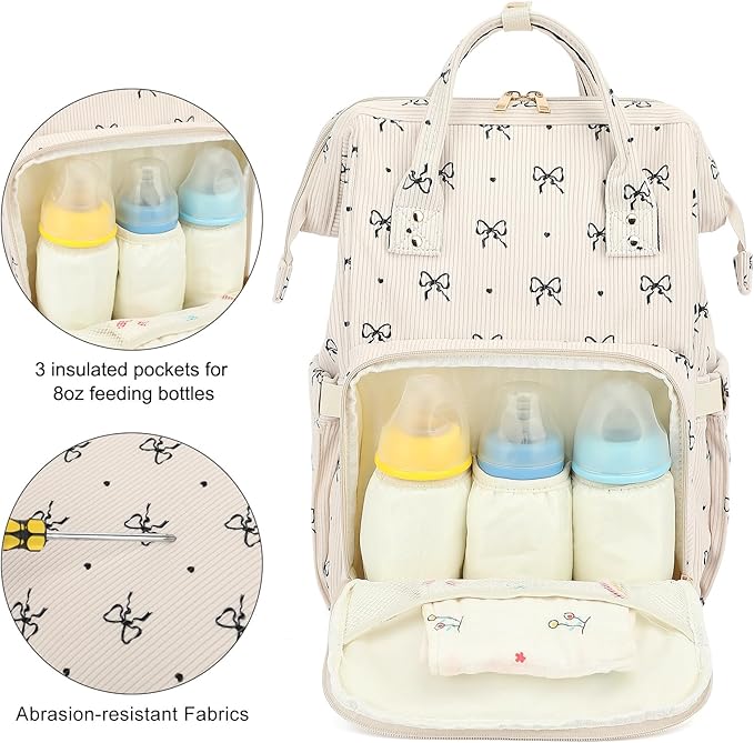 【Large Capacity】Size: 11.8L x6.3W x 16.5H inches; diaper backpack has a wide-opening main compartment for all most baby essentials, 2 side pockets for tissue and bottle, and a front compartment with 3 insulated feeding bottle pockets.