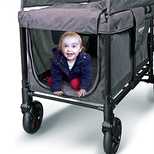 Zipper front door allows children to crawl in or out of the wagon without the need of parents to carry.