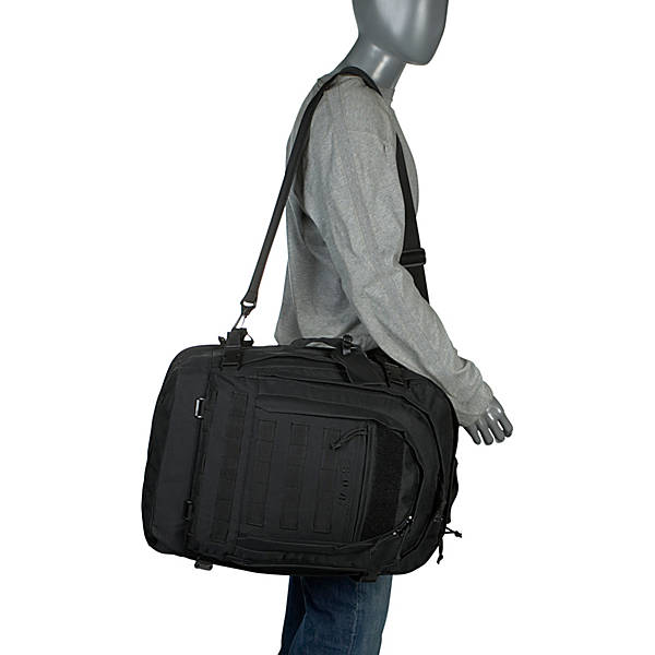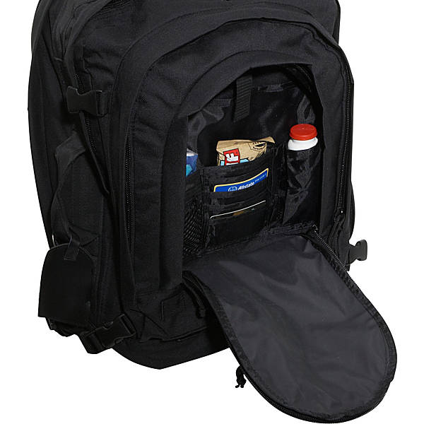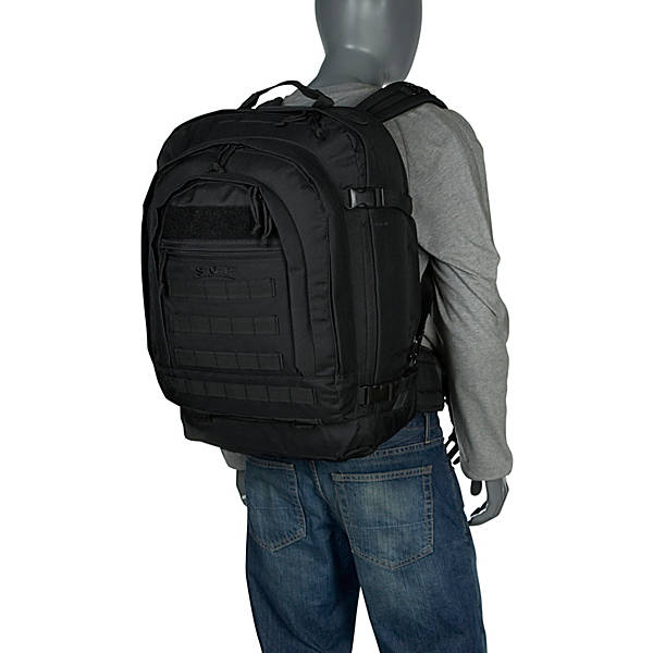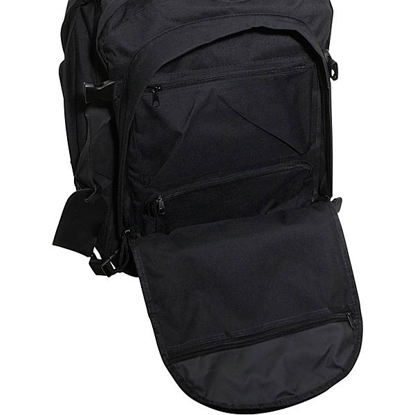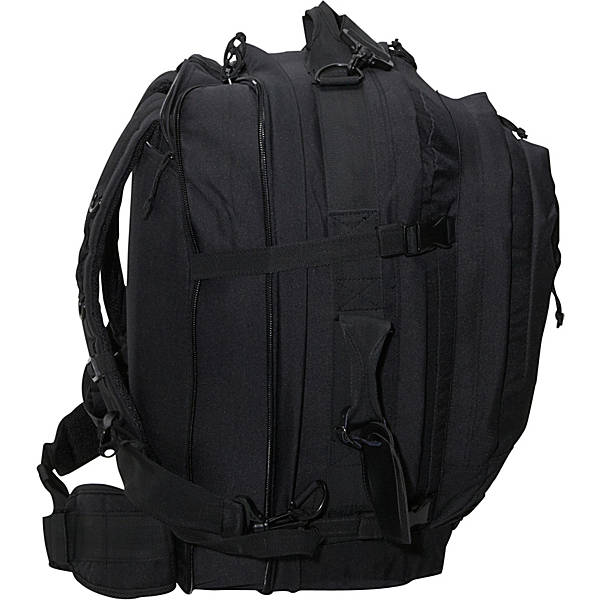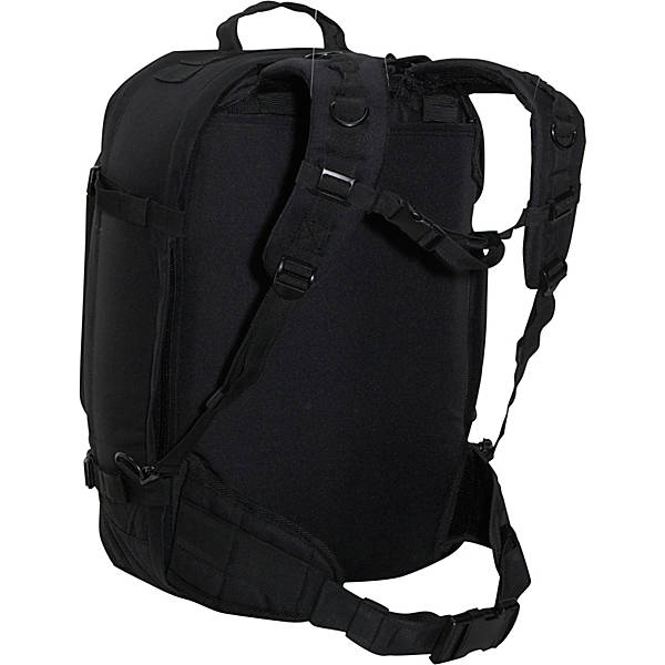 Keep your light travel or adventure essentials stylishly stowed and neatly organized in the SOC Gear Bugout Bag – 600 Denier Poly/Canvas ¨C Black. This compact, lightweight, and durable polyester and canvas backpack features an expandable main compartment with a convenient clam-shell opening and compression straps for easier pacing and easier access to stored items; a front zippered organizational panel with multiple open slots and zippered pockets; and a hydration-compatible zippered rear compartment. Side and top carry handles allow carrying versatility and it comes with a concealable, padded, adjustable shoulder harness.