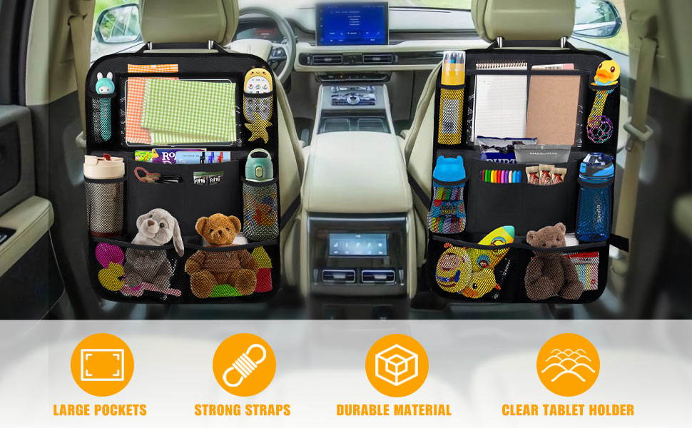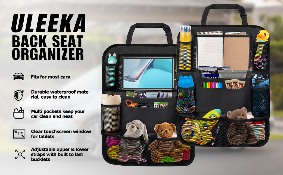 Each backseat organizer comes with a touch screen iPad display holder. We know how impatient your children can get, and now they can watch their favorite shows or play their favorite games while on the go.