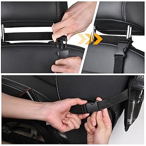 The strap is equipped with an adjustable buckle, you can adjust it to fit your car seat, ideal car organizer and storage assistant for different types of cars such as vans and SUVs. By attaching it to the back seat, it takes up less space than a storage box.