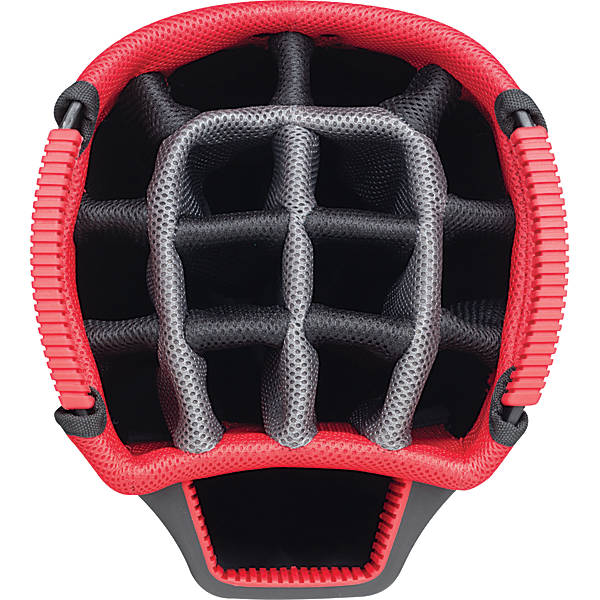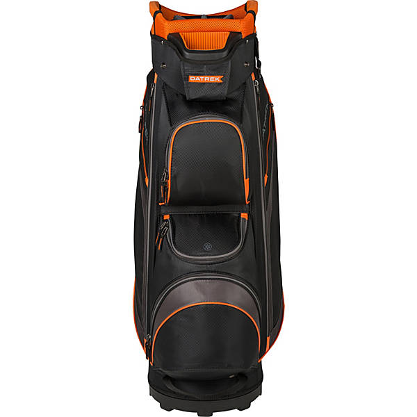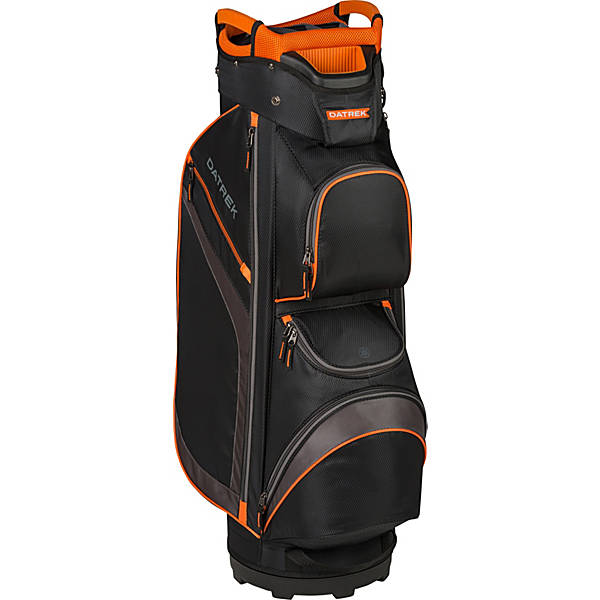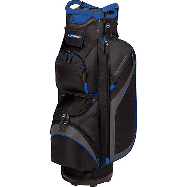 Carry your golf clubs and other sporty essentials in style inside this sleek black cart bag from Datrek. Made from durable nylon fabric, the Datrek DG Lite II Cart Bag features a well-constructed design with a 15-way top with full length club dividers, a total of seven additional storage pockets, and lift assist handles that make it easy to lift from your car to your golf cart. Detailed with pop color accents and trim, this cart bag includes two oversized apparel pockets, a large golf ball pocket, a fleece-lined pocket to hold your valuables, and an insulated cooler pocket for beverages. An oversized putter well fits a jumbo grip, while small pockets provide storage for tees, gloves, towels, and other essentials.