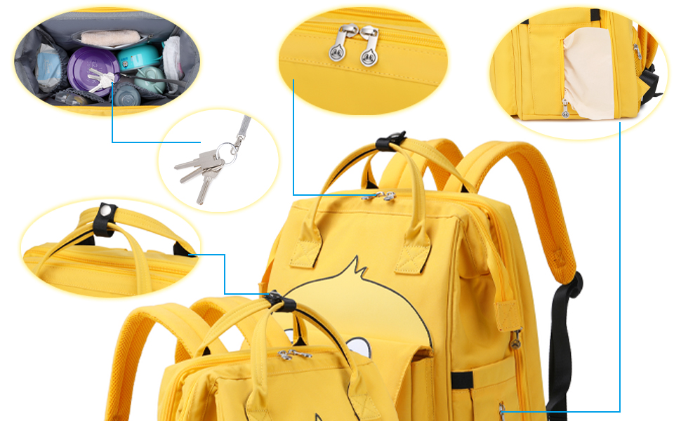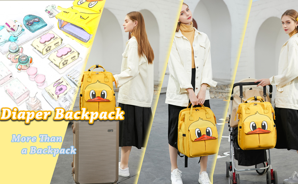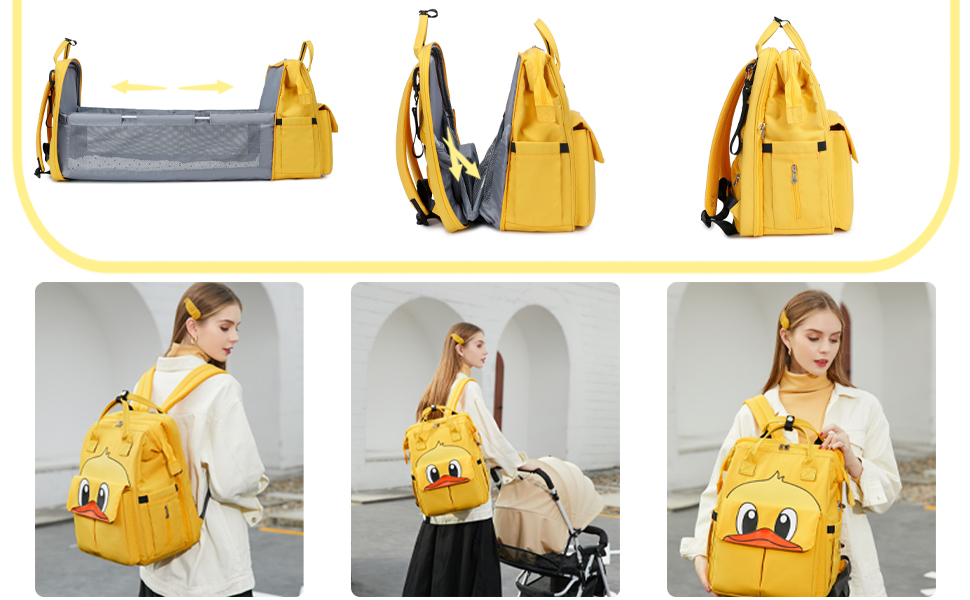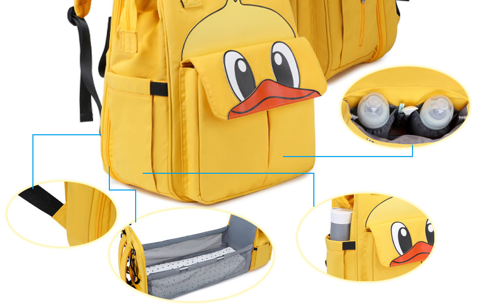 ¡¤ ¡¾Unique cartoon yellow duck mouth design¡¿acbags.com diaperbags Cute cartoon yellow duck is the inspiration of design. As a gift to a mother who is about to become a mother or has just had a baby, baby diaper backpack must be a pretty good choice. In addition to baby bottles, milk powder and new clothes, the diaper bag with a diaper changing table also appears on every mother's gift list for her newborn.