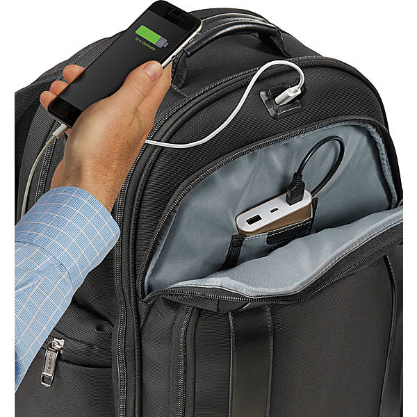¡¤ Exterior USB Port connects any USB device to a Power Bank (battery) when power is needed. Dedicated interior pocket with USB cord holds your Power Bank and connects to external USB Port. RFID-blocking pocket keeps credit cards and passport protected against loss and identity theft. Padded and quilted corduroy pocket for laptops up to 17 inches plus a separate padded tablet sleeve. High-quality ballistic nylon fabric with DuraGuard coating features stain and abrasion resistance. Genuine leather carry handle and accents.
