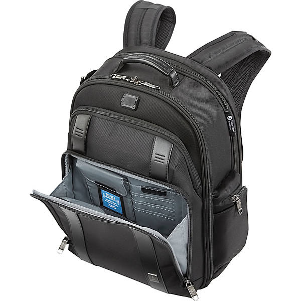 Charge up your devices when you're on the go with the USB port backpack from Travelpro. The Travelpro Executive Choice 2 17″ Checkpoint Friendly Backpack is made from DuraGuard ballistic nylon fabric and features a large shape with multiple compartments for storage and an exterior USB port that connects to an inner pocket to hold your PowerBank or portable battery. Detailed with a protective laptop pocket and a separate tablet sleeve, this backpack includes RFID blocking pockets to hold credit cards, a built-in organizer to hold all sorts of small accessories, and a side zipper pocket for added storage. A top grab handle, a sliding sternum strap, and adjustable straps make it easy and comfortable to carry on every trip.