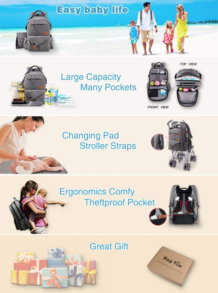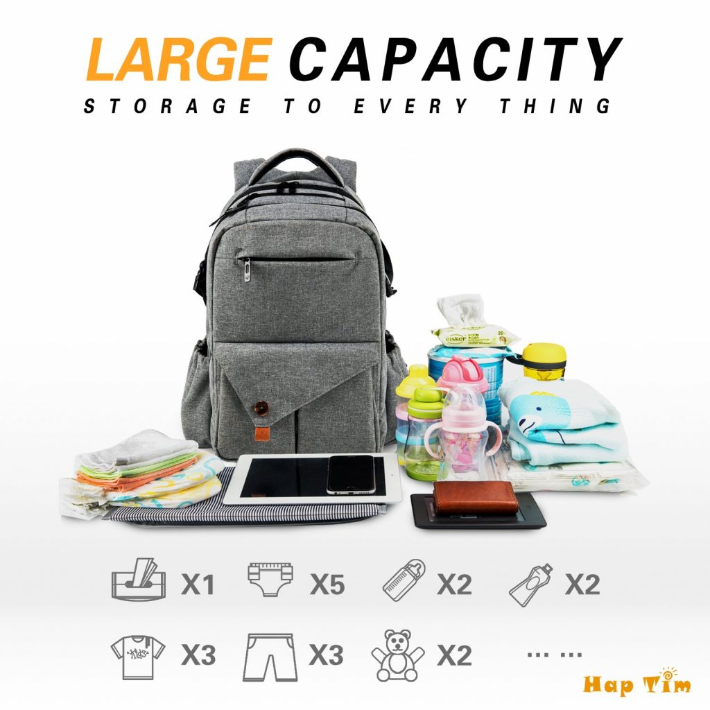 Hap Tim this backpack has front and back 2 separate big compartment which can fit many things you¡¯ll need to take care of ¨Cwhether for that emergency diaper change or a weekend at Grandma¡¯s. Besides diapers, it¡¯ll tote baby¡¯s extra clothes, snacks, and toys. It has many pockets to hold your ipad ,wallet, cell phone and more. Since you¡¯ll carry it everywhere you go, it is large enough to hold some of yours stuff,too.