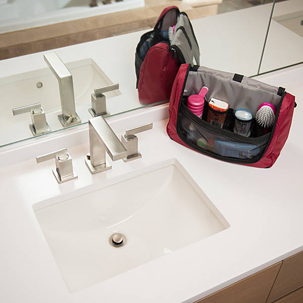 This is the perfect toiletry kit. The large size is great for the traveler who wants to make sure they have it all with them, or good for a couple packing together. The large opening allows you to organize your toiletries easily. Smart design that stands up on the counter or it can also hang for added versatility.