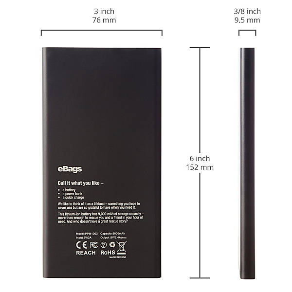 ¡¤ An eBags Lifeboat Quick Charge 9000 MaH battery is included.
