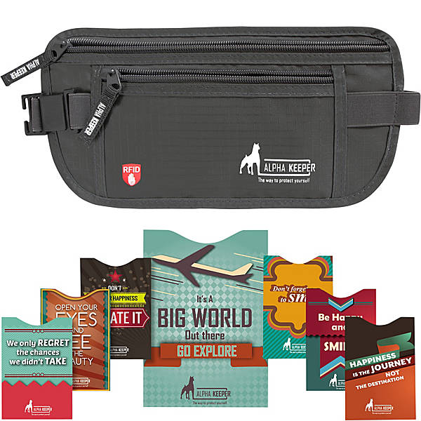 Protect your cards and keep your cash close at hand when you're on the go with this money belt and RFID sleeve set from Alpha Keeper. The Alpha Keeper RFID Money Belt and RFID Sleeves Set is made from ripstop nylon fabric and features a slim travel money belt with three layers of RFID-blocking material and a water resistant finish. With an adjustable waist strap that makes it comfortable to wear, this money belt can be worn over or under your clothing for added security. It includes two inner mesh compartments, two big zipper packs, and six RFID-blocking credit card sleeves that you can carry inside any wallet, handbag, or travel bag.