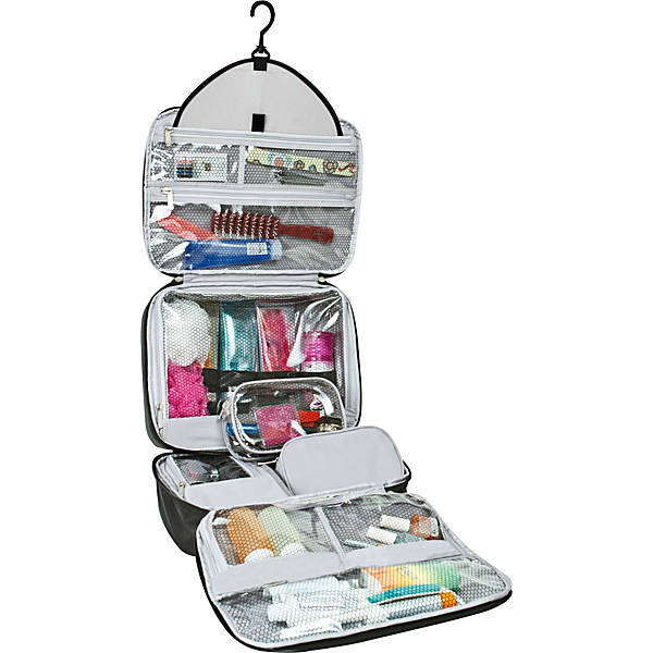 Loaded with pockets and compartments for organization, this toiletry kit offers easy access and storage for cosmetics, toiletries, shaving products, and any other small accessories that you need for travel. The Travelon Total Toiletry Kit is made from polyester fabric and features a multi-compartment design with four separate packing areas, two clear PVC zipper pockets, two removable pouches, and a spacious main compartment to hold full size bottles or clothing. Elastic loops in the large compartment help to hold bottles upright and in place while a hanger on the top makes it easy to hang this kit from a doorknob, a bathroom towel bar, or a shower rod.