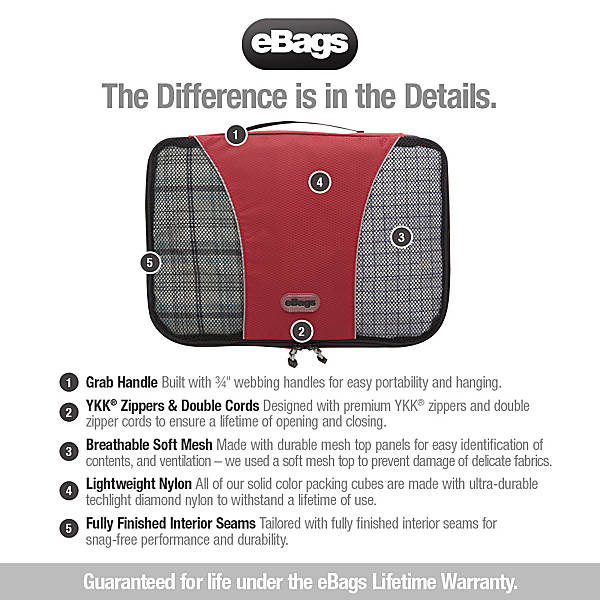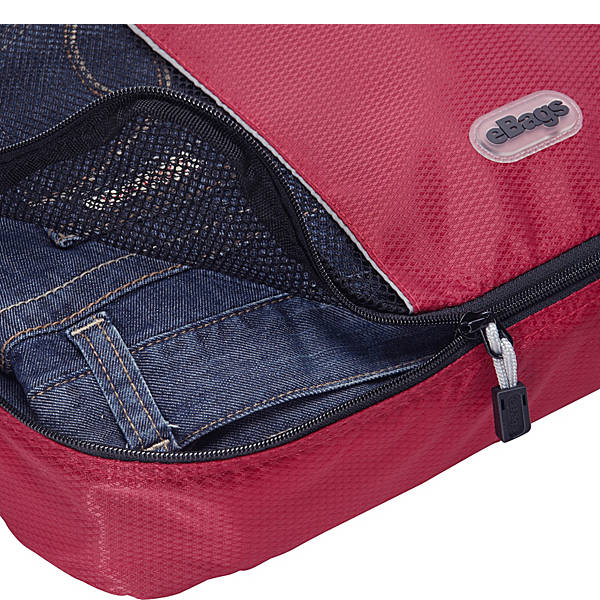 Get organized and maximize space inside your travel bag with this set of 6 packing cubes from eBags. The eBags Value Set: Packing Cubes + Slim Packing Cubes includes three slim cubes, one small cube, one medium cube, and one large cube, offering incredible organization for everything from socks and undergarments to jeans, pants, and sweaters. Each cube features a mesh top panel for ventilation and easy identification of the contents inside, fully finished interior seams for added durability, and a webbing handle for carrying convenience. Used one at a time or all at once, these cubes are ideal for use inside any carry-on bag, overnight bag, weekender, or oversized luggage.