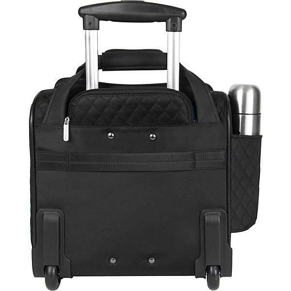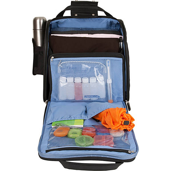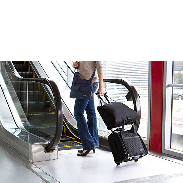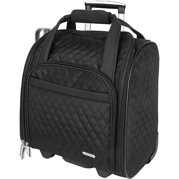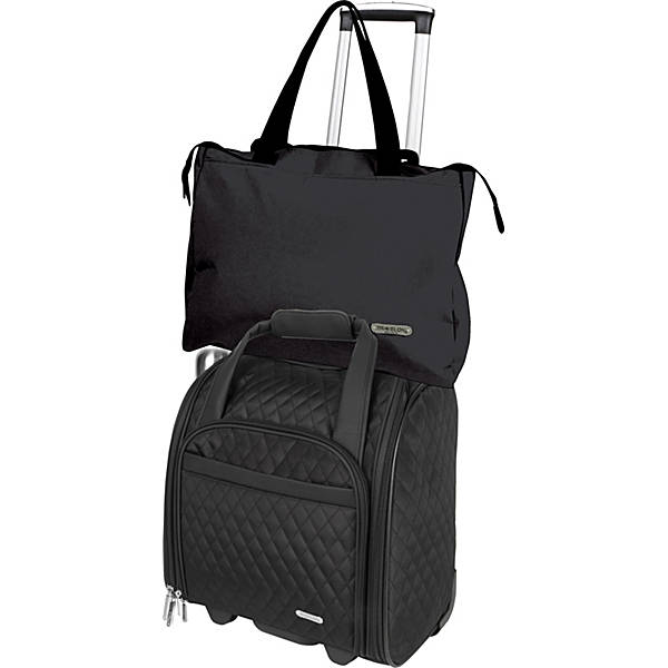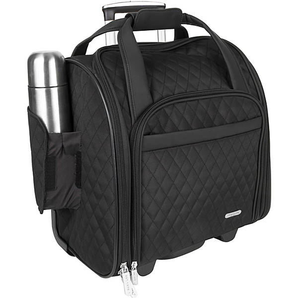 Carry all your essentials in comfort and style in the Travelon Wheeled Underseat Carry-On with Back-Up Bag. This exceptionally roomy wheeled, quilted bag with black trim features a large main compartment for storing clothing, shoes and other luggage, and three interior organizational pockets for keeping smaller essentials – office supplies, cosmetics, medications, and other small necessities neat and handy. Two zippered PVC mesh pockets on the inside front panel provide easy access, and a View Thru panel zips open for easy viewing of case contents and is packable. It even has a separate cooler compartment for keeping snacks and beverages cool. A full-size back-up bag folds away for laundry or extra storage, and the Travelon Wheeled Underseat Carry-On with Back-Up Bag comes with an Add-a-Bag strap on the back to attach it to your wheeled carry-on. The perfect travel bag!